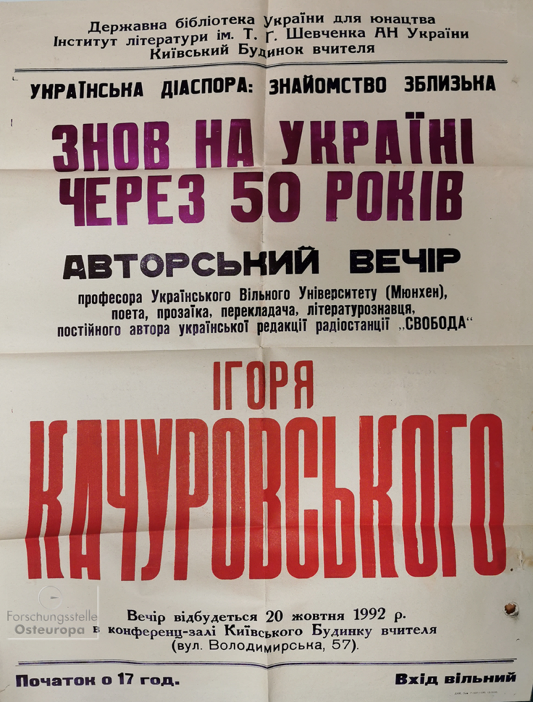 Poster advertising an event with Ihor Kachurovsky, Kyiv, 1992. Archive of the Research Centre for East European Studies. Photo: Elias Angele.
