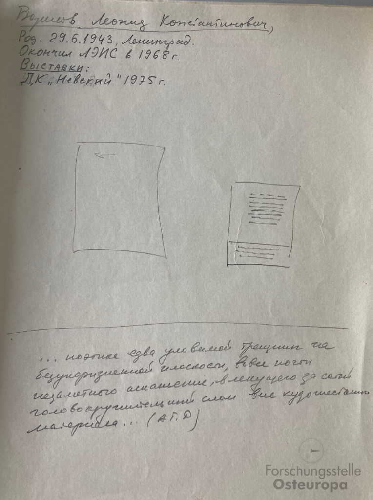 Perhaps the unprecedented nature of the exhibition prompted participants in the unofficial cultural scene to produce explanatory materials to contextualize the event. Unlike several other exhibitions, this one was accompanied by a samizdat exhibition catalog created by Arkady Dragomoshenko, Viktor Krivulin, and David Dar. The catalog included artists’ quotations, reproductions of their works, and essays written by the three authors, aiming to provide readers with the tools to understand non-objective art, which was still largely unfamiliar to the Soviet public.